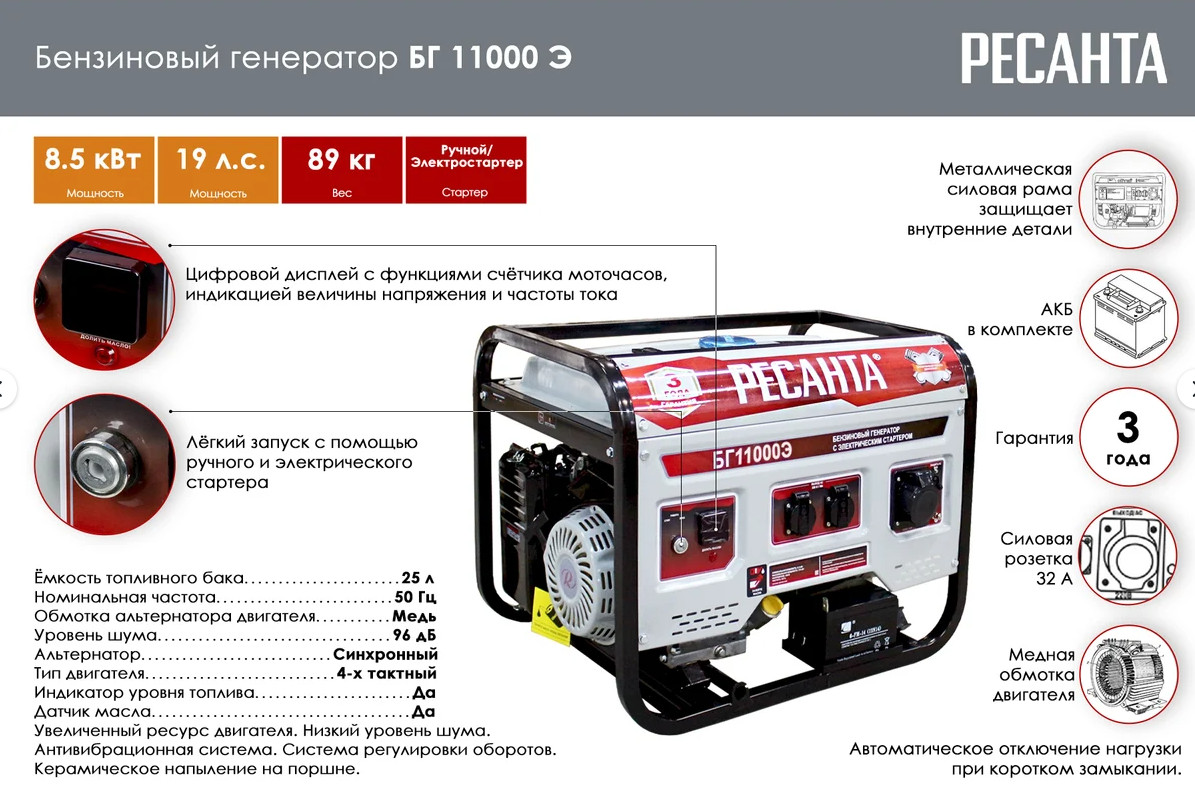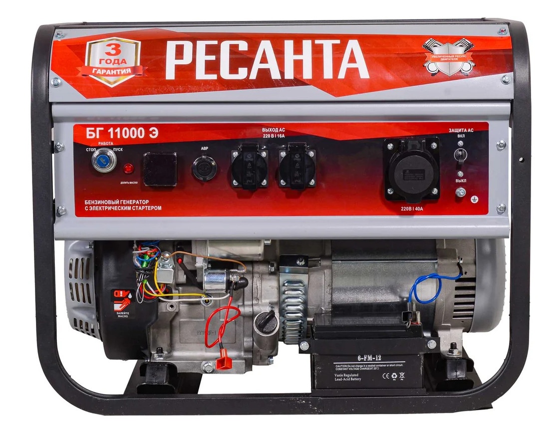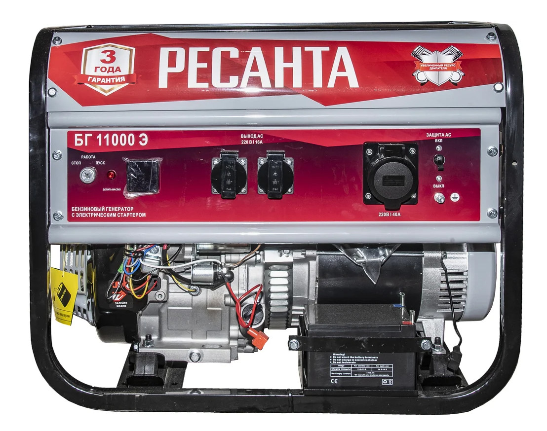 Бензиновый генератор Ресанта БГ 11000 Э – мощное и надежное устройство, способное обеспечить питанием в отсутствие электроснабжения строительную технику и частные домовладения. Повышенный ресурс работы двигателя и действующая система защиты от различных негативных факторов позволяет получить уверенность в длительном сроке эксплуатации.