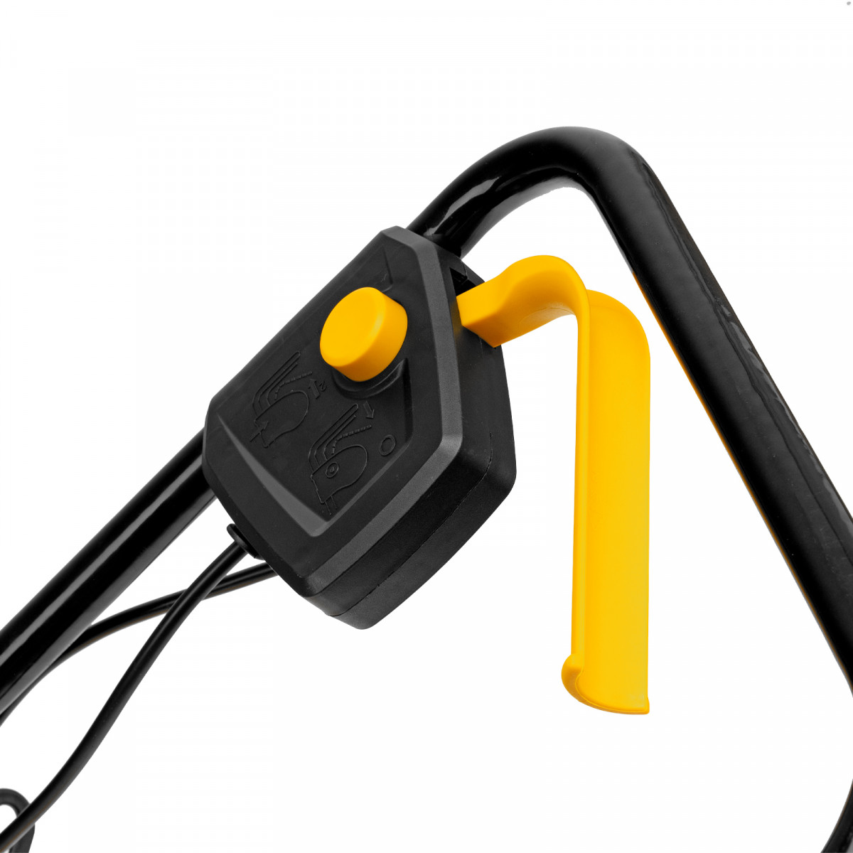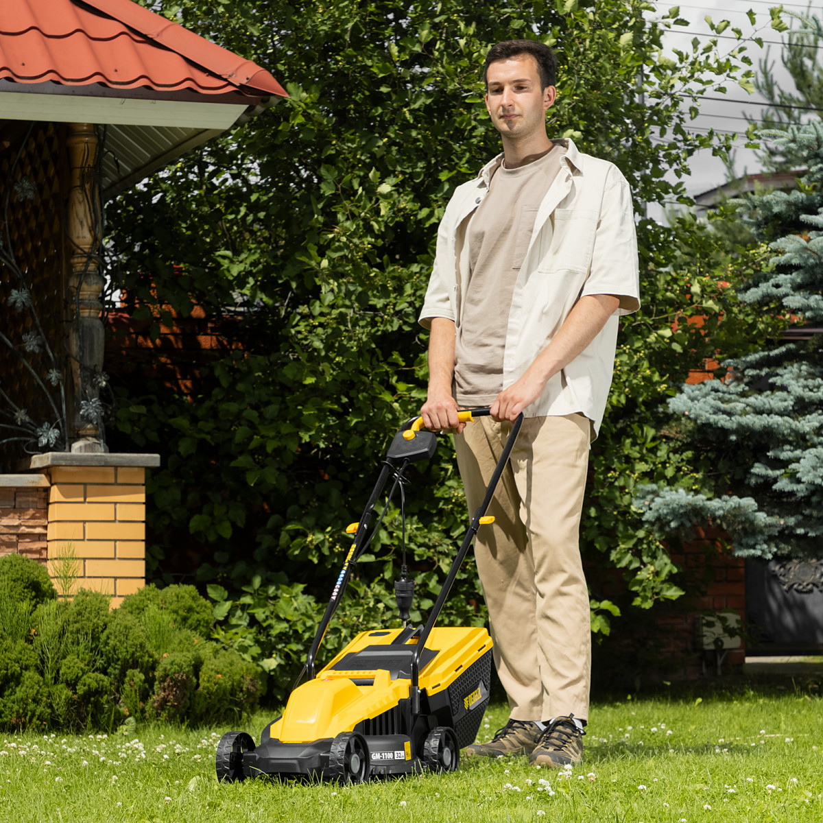 - Безопасность — функция блокировки исключает случайный запуск двигателя, а держатель кабеля предотвращает отключение техники от сети и уменьшает риск попадания провода под нож.