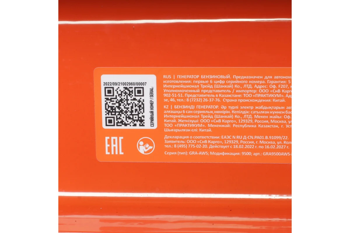 • Оснащен детектором угарного газа (при превышении нормы CO - генератор самоотключается)