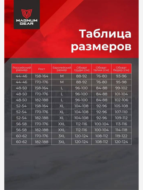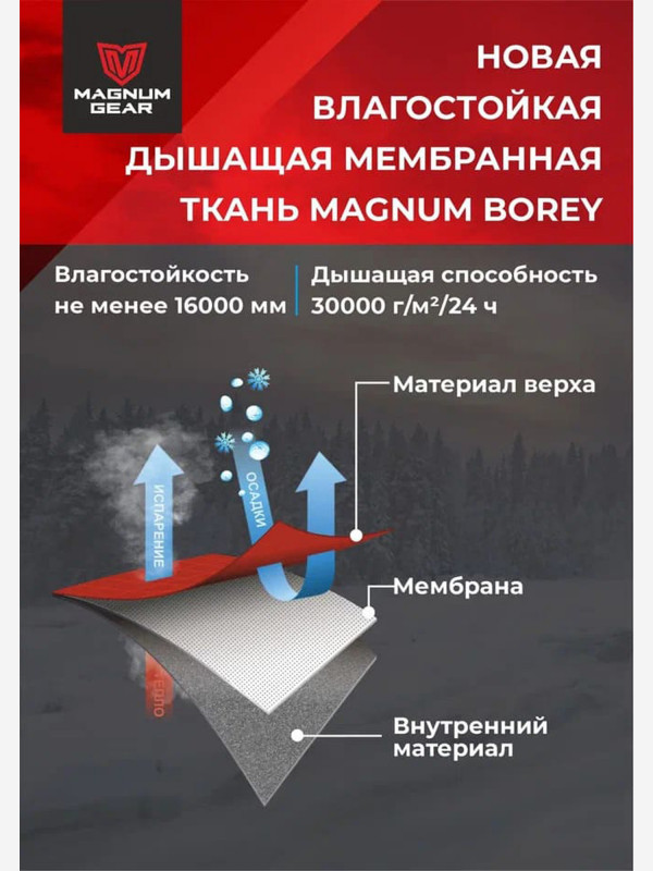 Костюм Iceberg предназначен для ходовой рыбалки при температуре до −30 °C. В разработке участвовал Мастер спорта России по рыболовному спорту, обладатель Кубка России по зимней блесне Константин Дубовик. На куртке и полукомбинезоне сведены к минимуму выступающие детали, за которые может зацепиться леска. В производстве костюма используется новейшая мембрана Magnum Borey с превосходными показателями паропроницаемости, а также высококлассный утеплитель Warmset с рекордными показателями теплоизоляции.Особенности куртки, полукомбинезона