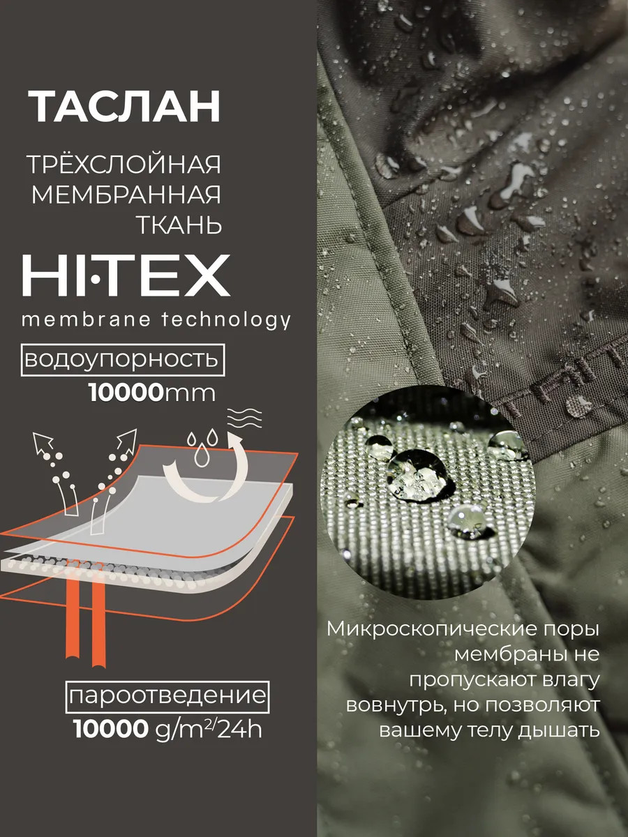 Костюм STRONG -40 ПК Таслан Хаки - это зимний костюм с полукомбинезоном, который отлично зарекомендовал себя среди охотников, рыболовов и любителей активного отдыха, подойдет под любое увлечение в зимний период. Рекомендуется использовать с термобельем Termo craft арт.279285980, или аналог. При низких температурах рекомендуется дополнительно использовать вторым слоем флисовый костюм Triton RICH арт.388130799. Таким образом, правильным будет использование с 1-ым слоем - термобельем, 2-ым слоем - флисовым комплектом и поверх надеваете костюм. При ношении мембранных костюмов не рекомендуем использовать вещи из натуральных тканей, таких как хлопок, или шерсть. Вещи из натуральных тканей не испаряют влагу тела, а накапливают ее в себе (намокают) и, как следствие вы сначала мокнете, а потом замерзаете. Ткань Таслан (100% нейлон) —плотный, износостойкий материал. Мембрана HITEX с показателями 10000/10000 легко справится с ветром, дождём и снегом, при этом сохраняя отличные дышащие свойства. Утеплитель TRITERM — на 30% легче синтепона, но теплее! Внешняя поверхность блокирует ветер, а внутренний слой ткани защищает от избыточной влаги. Подклад Флис - мягкий ворсистый материал, позволяет телу дышать, отводит влагу от тела, быстро сохнет и обладает теплоизолирующими свойствами.Куртка средней длины, полукомбинезон с эластичными вставками Ветрозащитная планка центральной молнии. Двухзамковые молнии на куртке и брюках 6 внешних карманов и внутренний карман на куртке 4 кармана на брюках. Анатомический крой колена. Анатомический крой рукава. Регулируемый капюшон. Регулировка ширины по низу куртки. Эластичные манжеты на рукавах с прорезью под большой палец. Противосугробные манжеты.Технологии, которые работают: Мембрана с показателями 10 000 мм водонепроницаемости и 10 000 г/м²/24ч паропроницаемости — вы останетесь сухими при любой непогоде, а тело будет «дышать» даже при самых активных нагрузках. Усиленные швы и эластичные вставки — костюм не порвется и не потеряет форму.