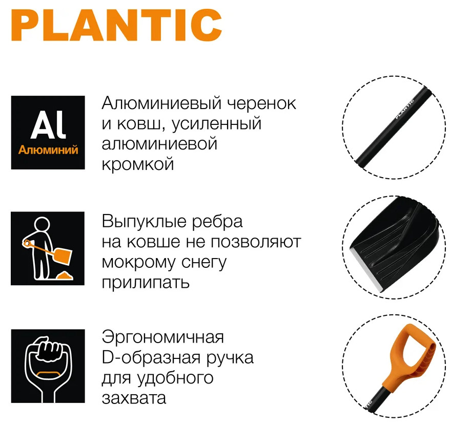 Ковш изготовлен из полипропилена и усилен алюминиевой кромкой. Выпуклые ребра на ковше не позволяют мокрому снегу прилипать.