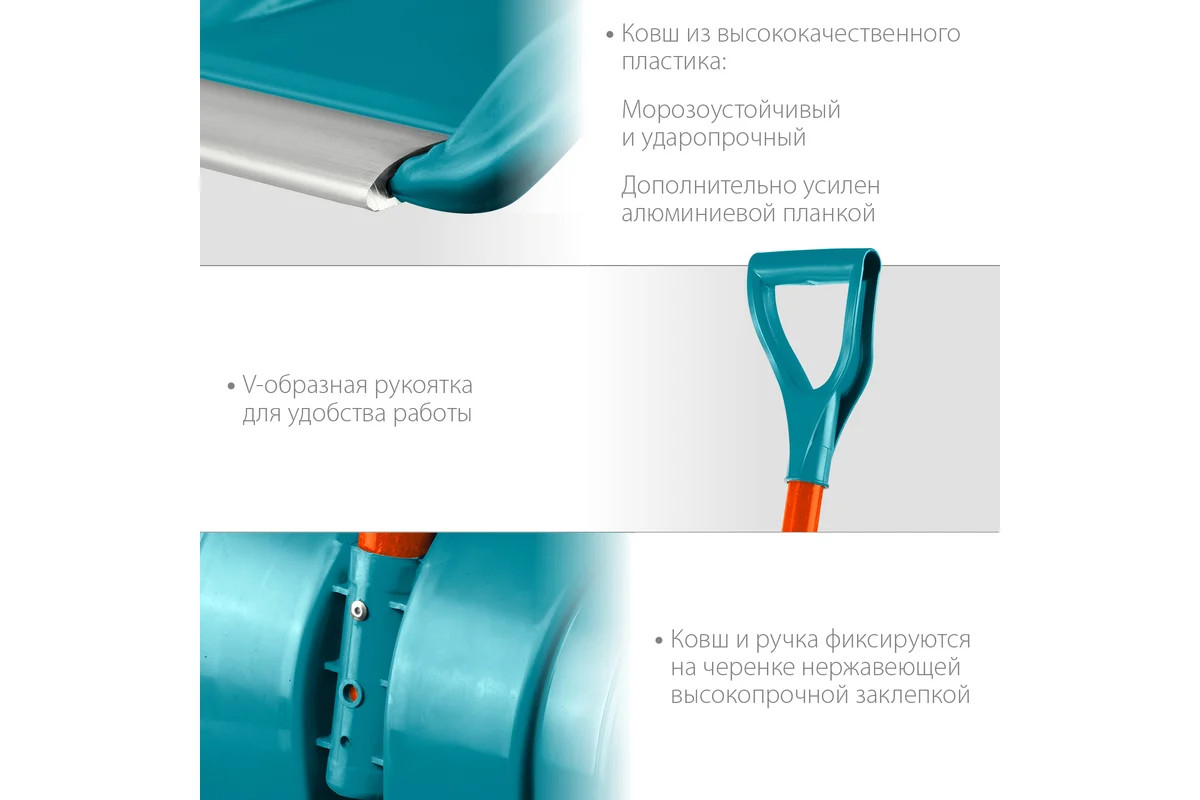 Пластиковая снеговая лопата Grinda PROLine Fiber-500 500 мм 39940 подходит для очистки территории от снега. Этот высококачественный инструмент создан специально для работы в холодное время года и сочетает в себе продуманную функциональность и продолжительный срок службы. Надежность. Рабочая часть лопаты изготовлена из морозоустойчивого ударопрочного пластика и имеет алюминиевую окантовку, защищающую кромку рабочей поверхности от повреждений. Эргономичный стеклопластиковый черенок с v-образной рукояткой обеспечивает удобство использования. -Особо прочный и одновременно легкий фибергласовый черенок. -Позволяет комфортно работать на морозе без перчаток. -V-образная рукоятка для удобства работы. -Ковш из высококачественного пластика, морозоустойчивый и ударопрочный. -Ковш дополнительно усилен алюминиевой планкой.