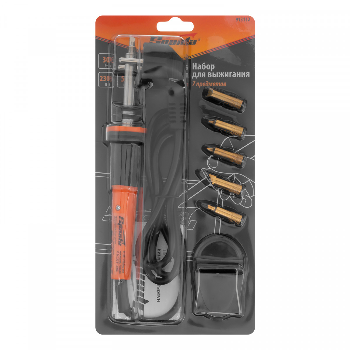 Набор для выжигания Sparta 913112 включает в себя все необходимое для создания изображений или орнаментов на деревянных заготовках — паяльник мощностью 30 Вт, подставку и сменные жала из латуни. Керамический нагреватель обеспечивает выжигателю стабильную работу и долговечность. Набор используется во время занятий творчеством.