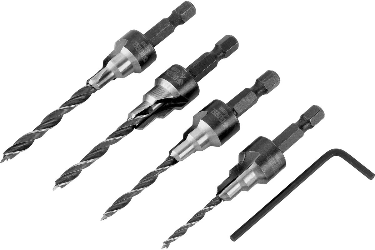Набор сверл под конфирмат включает 4 оснастки диаметром 3-5 мм, предназначенные для получения отверстий под евровинты в древесине, фанере и ДСП.