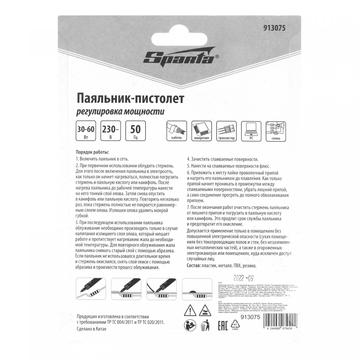 Паяльник-пистолет с регулировкой мощности 30-60 Вт, 220 В Sparta