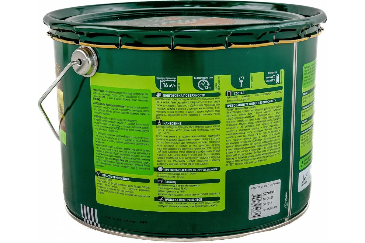 Декоративное средство Pinotex Classic обладает антисептическим действием, хорошо подчеркивает природную текстуру материала. Пропитка содержит активные добавки против плесени и синевы. Окрашенная поверхность устойчива к воздействию солнца, дождя, снега и мороза. Pinotex Classic легко наносится и быстро впитывается в поверхность древесины, образуя полуматовое покрытие. Подчеркивает естественную текстуру древесины. Для усиленной защиты глубоких слоев древесины от биокоррозии рекомендуется применять пропитку в системе с грунтовкой Pinotex Base.