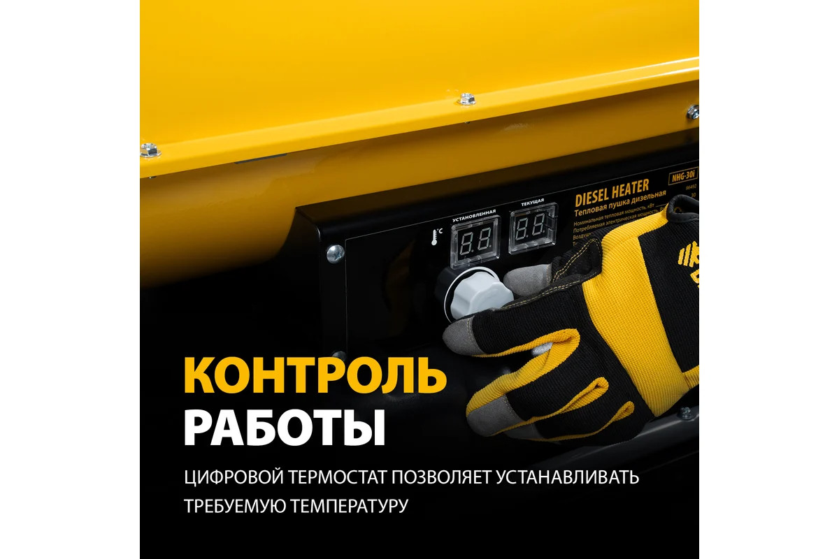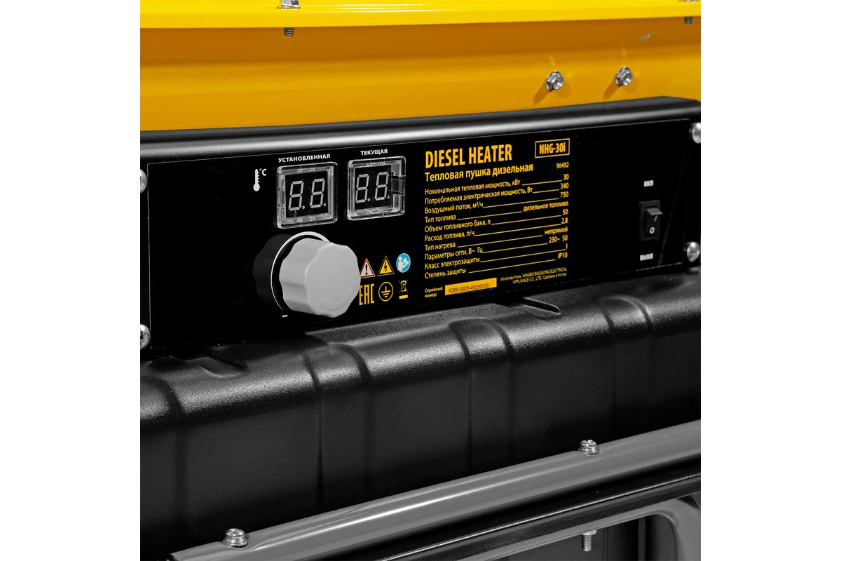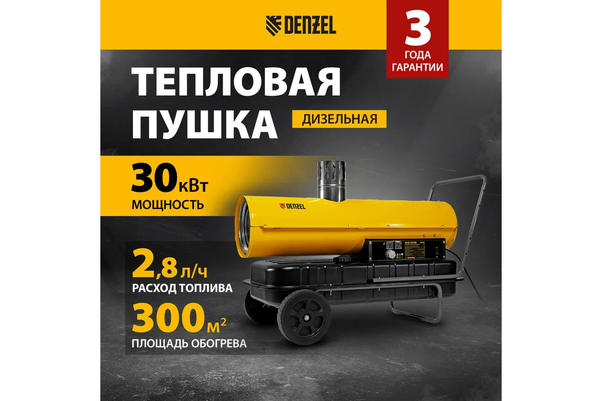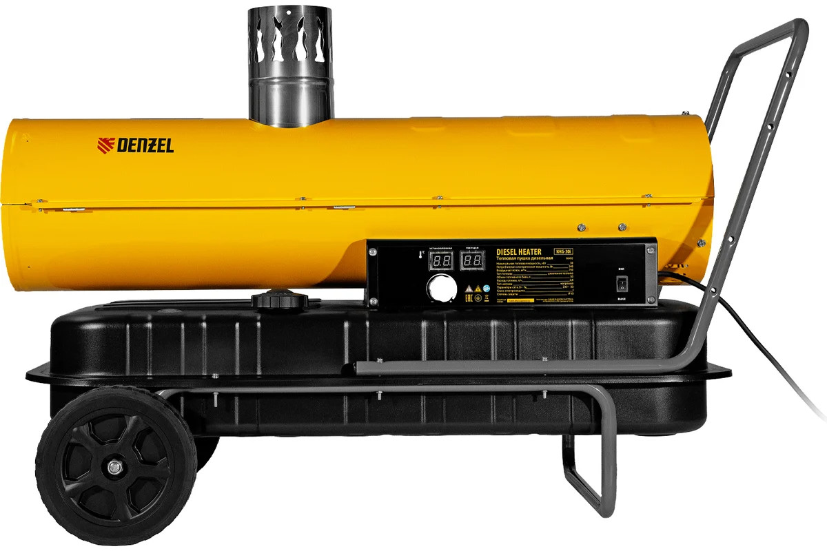 Дизельная тепловая пушка непрямого нагрева DENZEL NHG-30i 96492 с цифровым термостатом обладает тепловой мощностью 30 кВт и генерирует поток теплого воздуха 750 м3/ч.