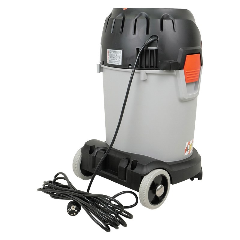 Корпус пылесоса выполнен из ударопрочного пластика. Пылесос оснащен системой циклон и надежным складчатым полиэстровым фильтром с площадью поверхности 3500 кв.см, максимально автоматизирован – оснащен розеткой для электроинструмента и автоматикой, которая активизирует пылесос в момент включения инструмента. Пылесос работает как с мешками, так и без мешков, собирая мусор в бак. Байпасная схема прохода воздуха позволяет производить как сухую, так и влажную уборку - убирать негорючие и неагрессивные жидкости и обеспечивает стабильное охлаждение двигателя. Пробка в нижней части бака дает возможность аккуратно слить собранную жидкость. Переключение в режим выдува позволяет убирать мусор с поверхностей без сбора его в бак.