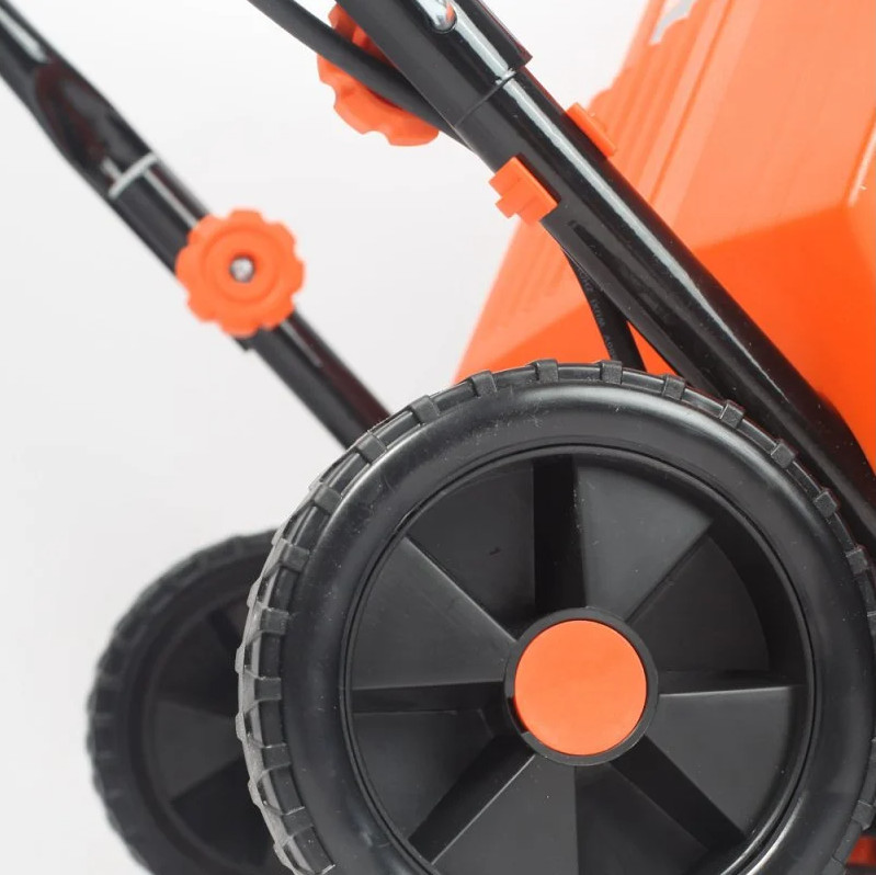 Небольшой вес и дополнительные колеса обеспечивают максимально комфортную и быструю уборку, а регулируемый желоб позволяет настроить выброс снега.