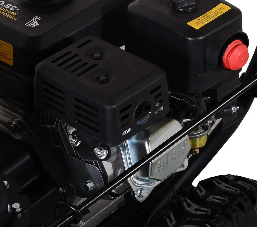 Модель оснащена мощным бензиновым двигателем с воздушным охлаждением, запуск которого осуществляется вручную. Топливный бак вмещает 3 литра бензина АИ-92. Снегоуборщик одинаково легко справляется с уборкой свежевыпавшего снега и плотных оледеневших слоев благодаря прочному шнеку с множеством острых резцов. Ковш имеет ширину захвата 56 см, высота забора снега составляет 42 см. Желоб выброса можно поворачивать в нужную сторону прямо в процессе работы. Снегоуборочная техника установлена на большие приводные колеса с ярко выраженным зимним протектором, что делает ее более маневренной и исключает риск проскальзывания. Машина имеет стандартную комплектацию скоростей: 4 вперед и 2 назад. Управление самоходной установкой может осуществлять человек с любыми физическими данными. Особенностью данной модели является компактность. Благодаря небольшим габаритам снегоуборщик легко проходит в узких местах: между грядками, деревьями, ограждениями.