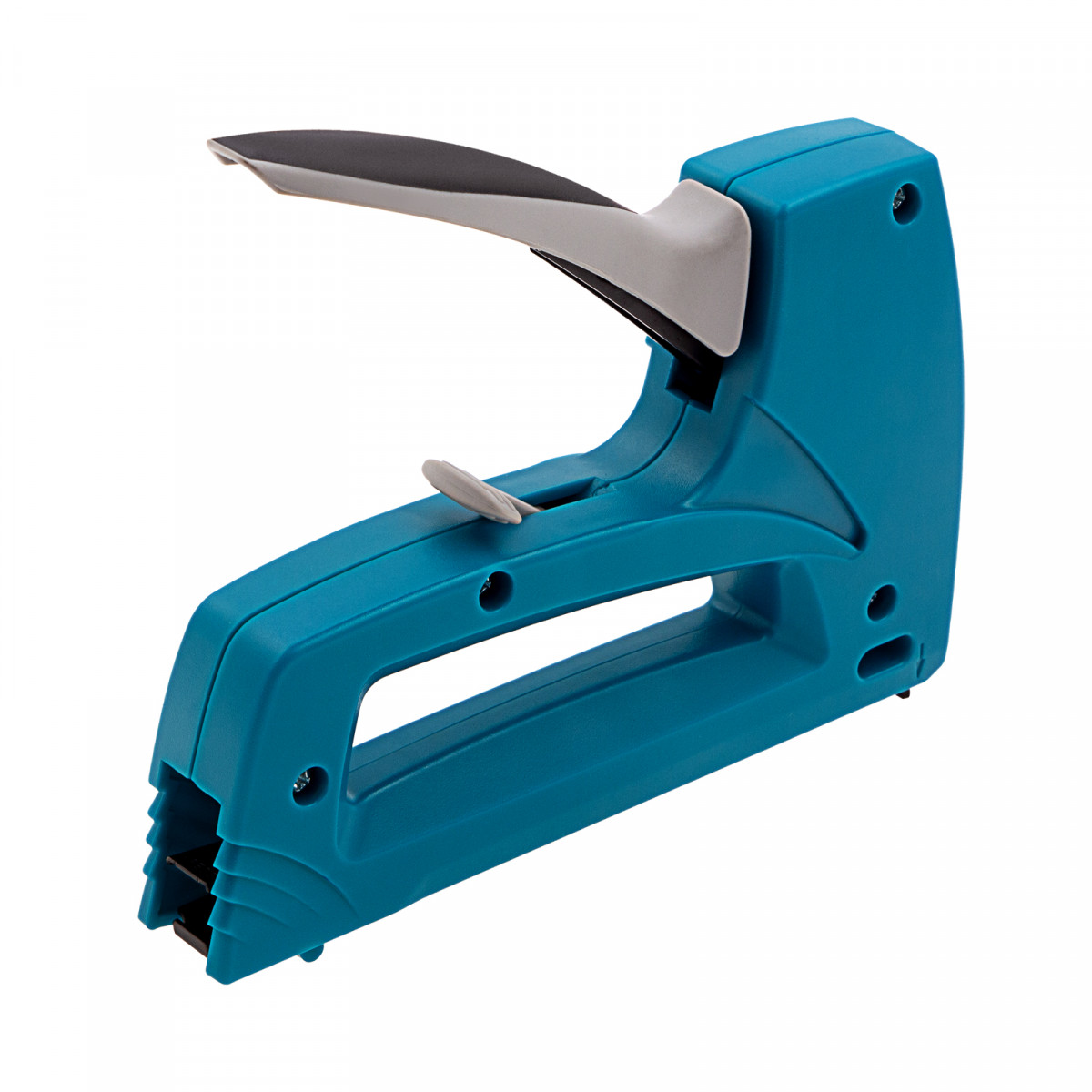 4-функциональный пластиковый мебельный степлер Gross Universell 4 41005 — универсальный инструмент, совместимый со скобами типа 53 размером 8-14 м, 36 размером 12-14 мм, гвоздями типа 300 и штифтами типа 500 размером 16 мм. Предназначен для скрепления с деревянным основанием фанеры, картона, ДСП, ДВП, оргалита, пленки, утеплителя и других листовых материалов. Его используют для обивки мягкой мебели, сборки шкафов, монтажа низковольтных проводов, выполнения багетных и других крепежных работ. Степлер рекомендован для профессионального применения, но будет полезен и в быту. Поставляется со скобами типа 36 в количестве 100 штук, скобами типа 53 (200 штук) и с гвоздями типа 300 и 500 (100 штук).