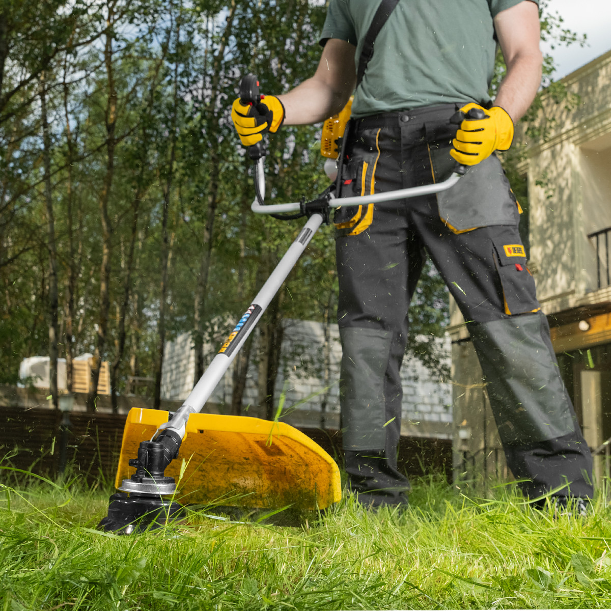 Бензиновый триммер Denzel DTL-33 96261 с объемом двигателя 33 см3 и неразъемной штангой подходит как для частичного подравнивания газона, так и скашивания травы всех типов, в том числе с жесткими древовидными стеблями (полыни, крапивы, лебеды, борщевика). Также эффективен для срезания кустарника и молодых побегов деревьев с диаметром стволов до 10 мм. Два режущих инструмента — леска и пильный диск — работают на скорости 9500 об/мин и обеспечивают ширину скашивания 42 и 25,5 см соответственно. Двигатель мощностью 1,8 л.с. экономично потребляет топливо, поэтому часто заправлять бак не придется. Триммер не требует подключения к стационарному источнику питания и может использоваться в самом отдаленном уголке дачного участка.