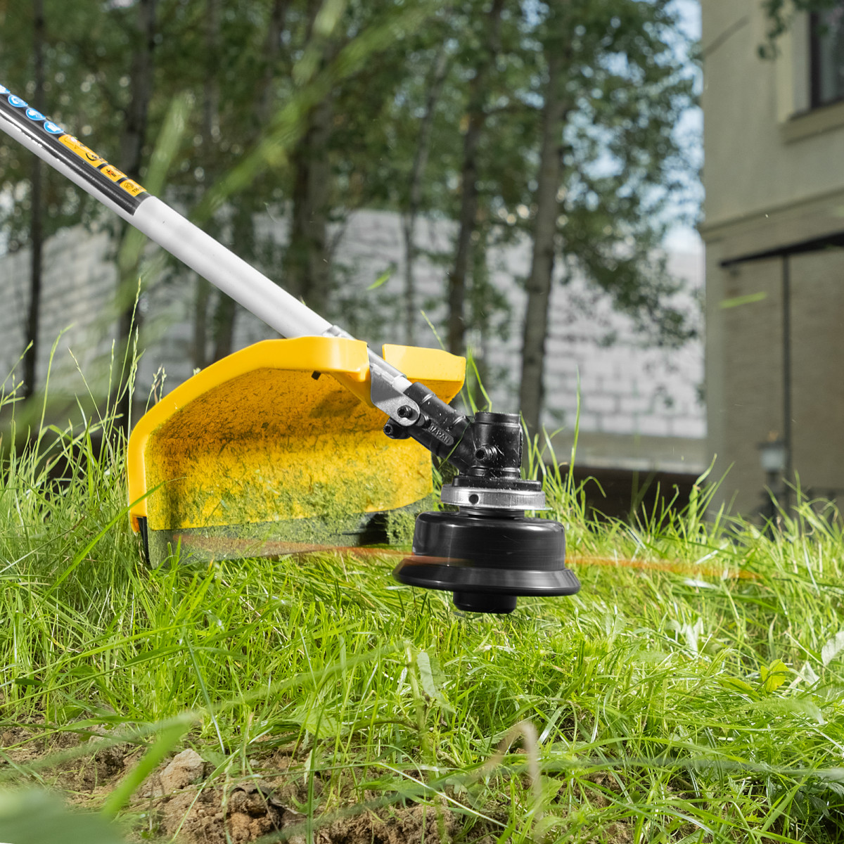 - Автоматическое укорачивание лески — в случае, если длина корда превышает допустимую, лезвие на кожухе триммера подрезает его, предотвращая лишнюю нагрузку на двигатель и его перегрев.
