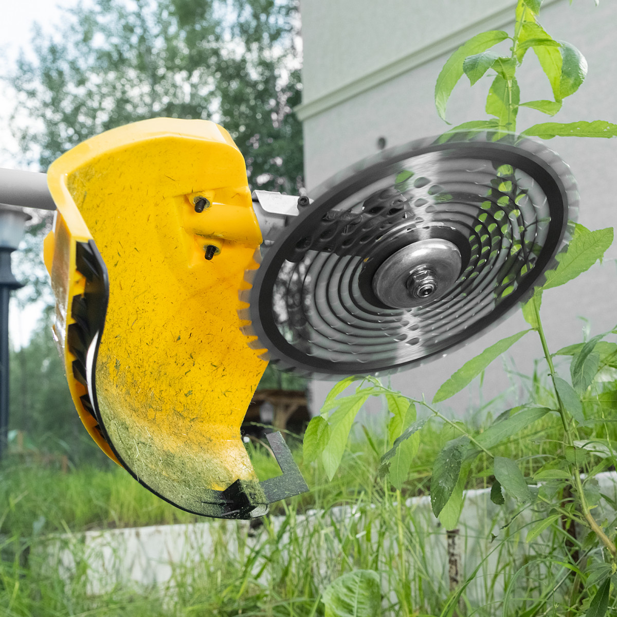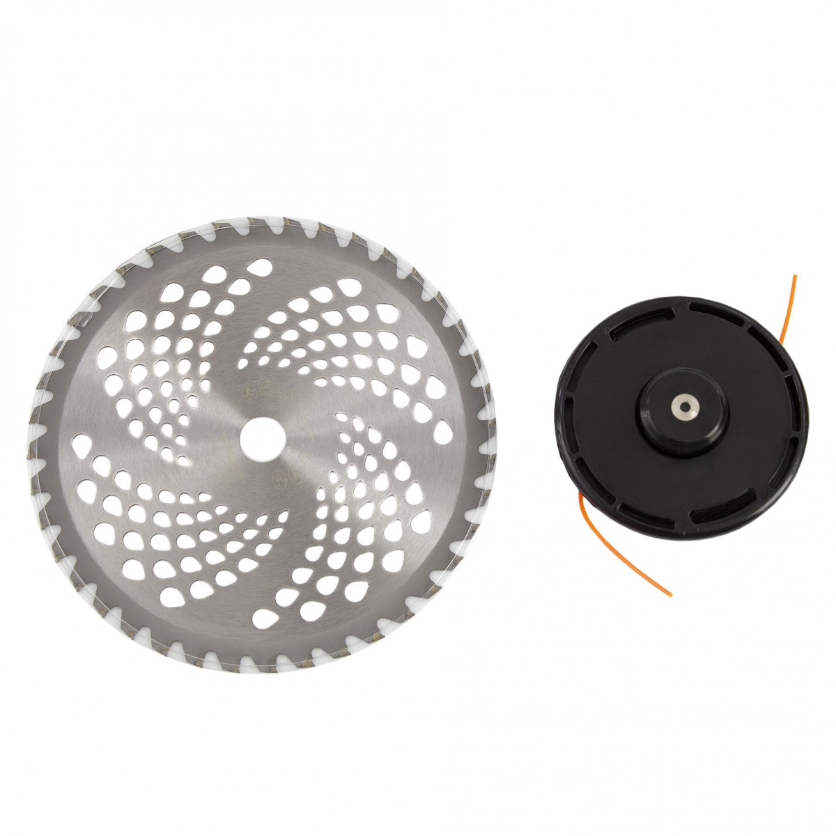 - Дополнительные возможности — можно приобрести и установить на триммер диски Denzel 96323, 96325 для быстрого удаления растительности с жесткими стеблями (полыни, крапивы, лебеды) или 96328 для скашивания молодых побегов кустарника диаметром до 3 мм.