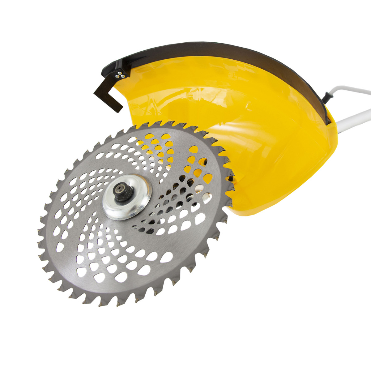 - Безопасная работа — защитный кожух закрывает режущую часть, поэтому в сторону пользователя не отлетают ветки и камни.